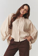 Detaliile distinctive, precum mânecile ample cu efect de încrețire și manșetele bine definite, adaugă un aer rafinat și contemporan. Gulerul clasic și rândul de nasturi frontali întregesc estetica unei piese care nu se demodează niciodată.