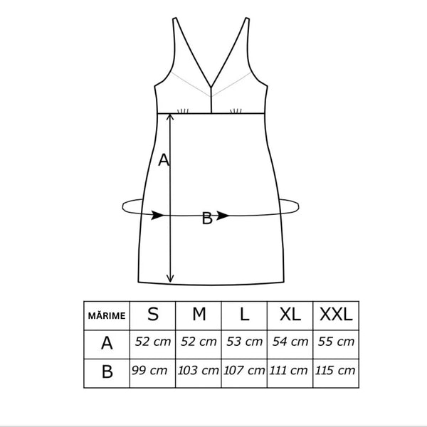 Modelul are bretele late care oferă stabilitate și acoperire suplimentară, fiind o opțiune practică și elegantă. Decolteul în V este decorat cu dantelă rafinată, iar elasticul sub bust evidențiază silueta într-un mod subtil. Lungimea până la genunchi completează look-ul cu lejeritate și stil.
