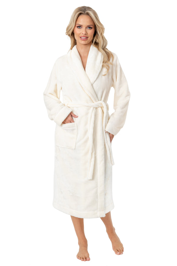 Halatul DONNA ecru este realizat din material soft gros și plușat, oferind căldură și confort premium, perfect pentru relaxarea de acasă.