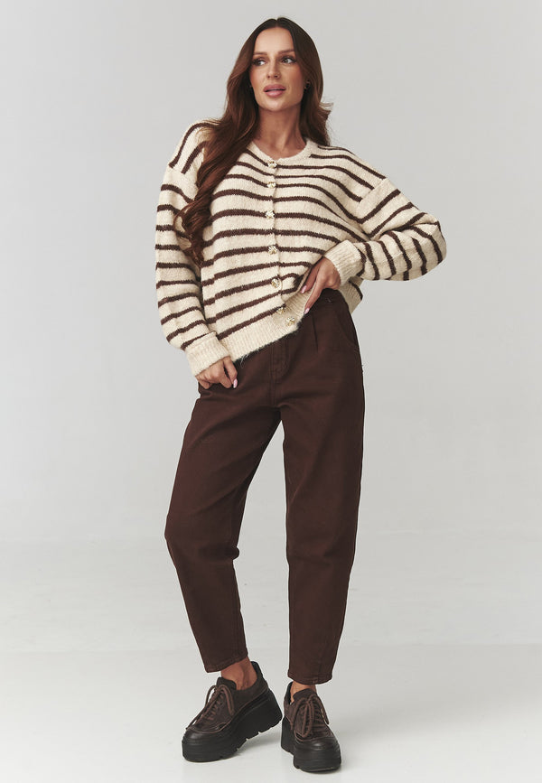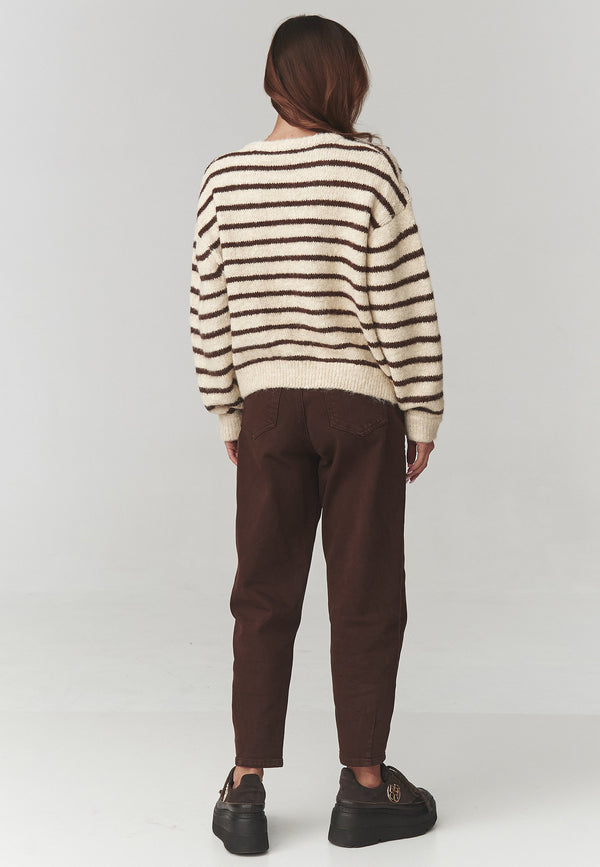 Pulover damă, tricot moale cu dungi și nasturi aurii bej – C23